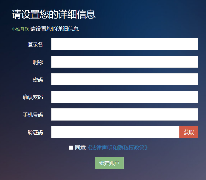 3、填写个人信息确认无问题后,点击【绑定帐户】完成注册。